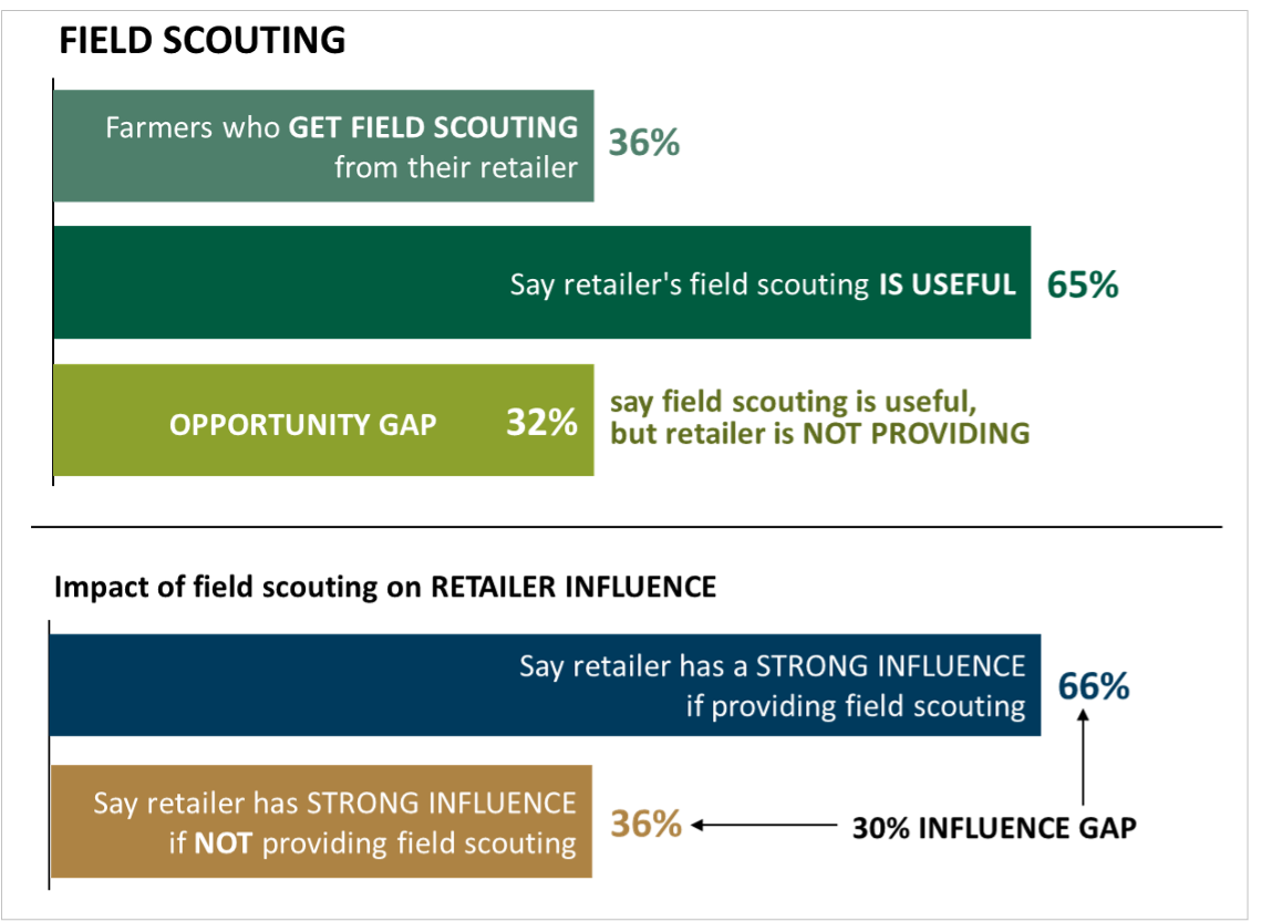 - When farmers receive field scouting services from their main ag retailer, those ag retailers have significantly more influence on the farmer’s purchase decisions.