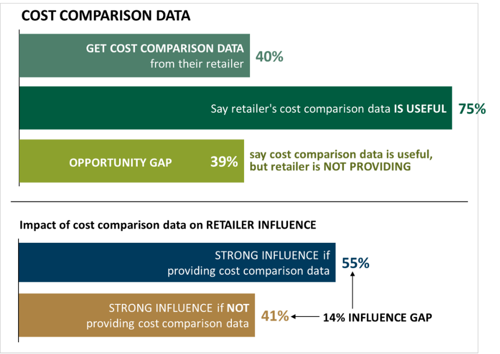 - When farmers receive cost comparison data from their main ag retailer, those ag retailers have significantly more influence on the farmer’s purchase decisions.