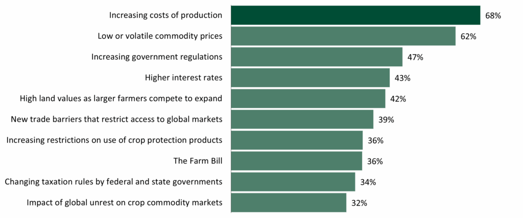 In January of 2025, we asked over 800 farmers across the USA about their level of concern on a list of 21 challenges that farmers currently face or may face in the future. This report focuses on what American farmers are most concerned about. For “increasing costs of production”, we dove in deeper to capture the voices of farmers on ways they are managing those costs.